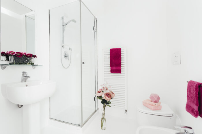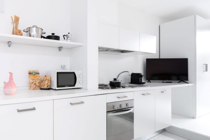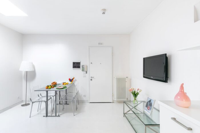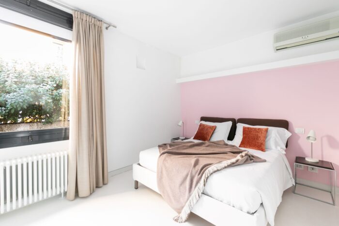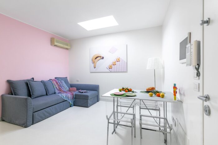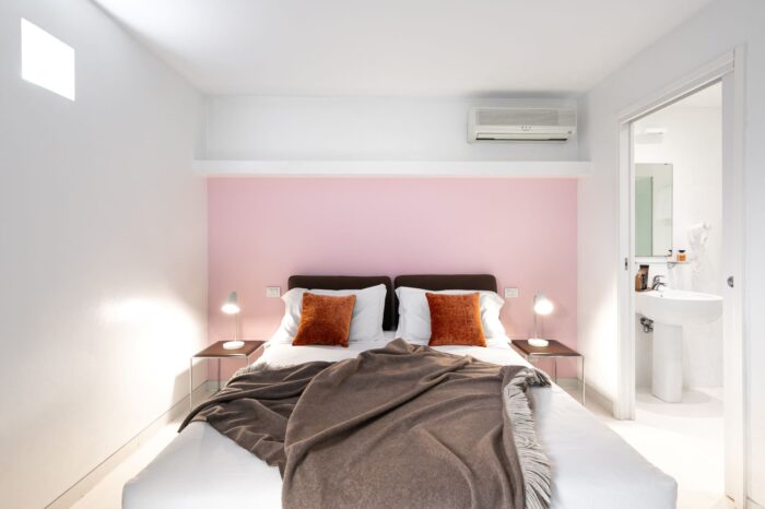Luminoso Bilocale di 42 mq, arredato con gusto raffinato pavimentato in resina bianca. L’appartamento è composto da: ingresso in zona giorno con un divano letto, angolo cottura completamente attrezzato (con piastre elettriche, frigorifero, forno elettrico, lavatrice) ed un tavolo con quattro sedie. Il bagno è completo di doccia. Ampia zona notte arredata con letto matrimoniale e scrivania. Il motivo decorativo dell’appartamento è il colore rosa pastello.