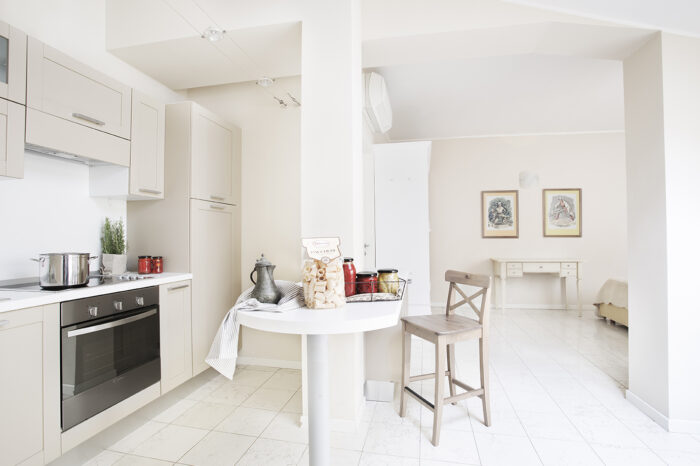 L’appartamento è un bilocale open di 44 mq composto da due zone comunicanti, ma distinte. Arredato con colori pastello, pavimentato in marmo. La parte giorno, che si affaccia su un terrazzo arredato con tavolo e sedie, è composta da un salotto con un divano, che all’occorrenza si può trasformare in un letto alla francese e da una cucina con penisola, completamente attrezzata, con piastre elettriche, forno elettrico, frigorifero, bollitore, lavastoviglie e tutti gli utensili. La zona notte ha un letto matrimoniale, e un bagno dotato di una doccia spaziosa.
